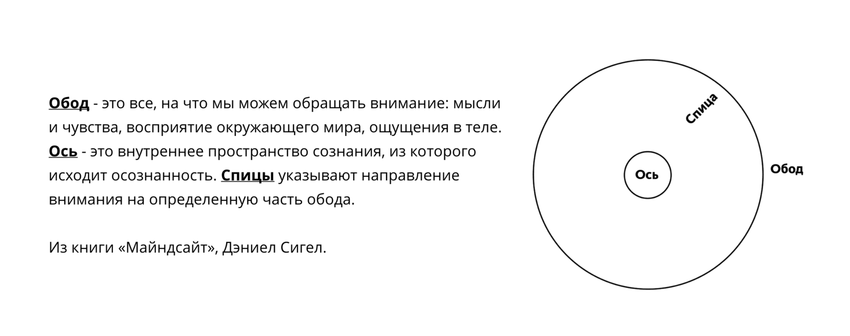 Понять какую роль в этом играет центрирование можно на примере модели “Колесо осознанности”, предложенной американским психиатром и нейробиологом Дэниелом Сигелом [3].