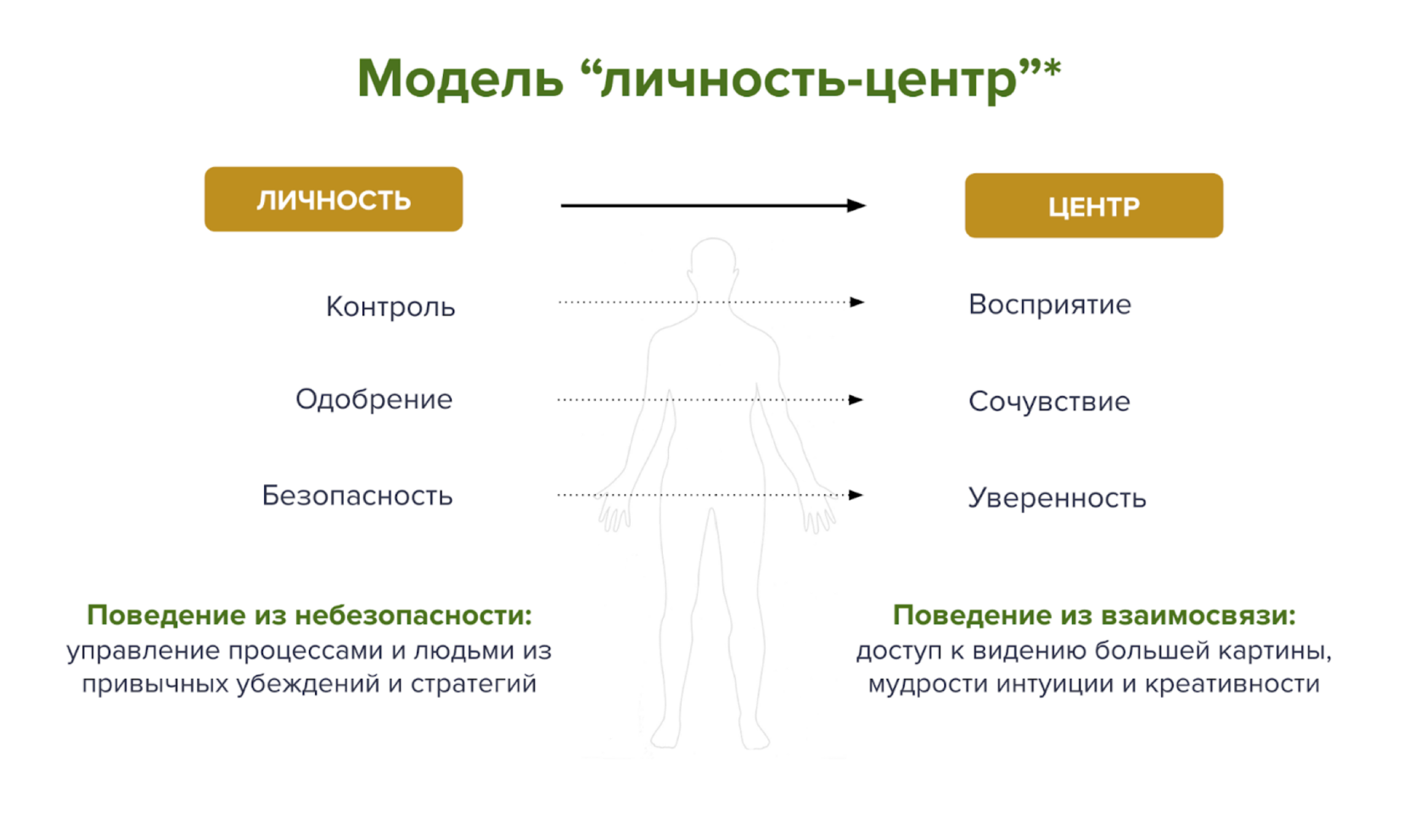 Для понимания этих изменений Венди Палмер предлагает модель “Личность - Центр” [2]. В своей книге “Воплощенное лидерство” она пишет о том, что в каждом из нас условно говоря есть две часть - Личность (Personality) и Центр (Center). Личность - это та часть нас, которая стремится наполнить нашу жизнь безопасностью. Когда эта часть управляет нашим поведением, мы действуем из ощущения небезопасности, управляем процессами и людьми, опираясь на привычные убеждения и стратегии. Мы склонны к контролю того, что происходит, поиску одобрения и похвалы со стороны других людей и стремимся к безопасности, в том числе через конформность и избегание риска. Знакомо вам такое поведение?